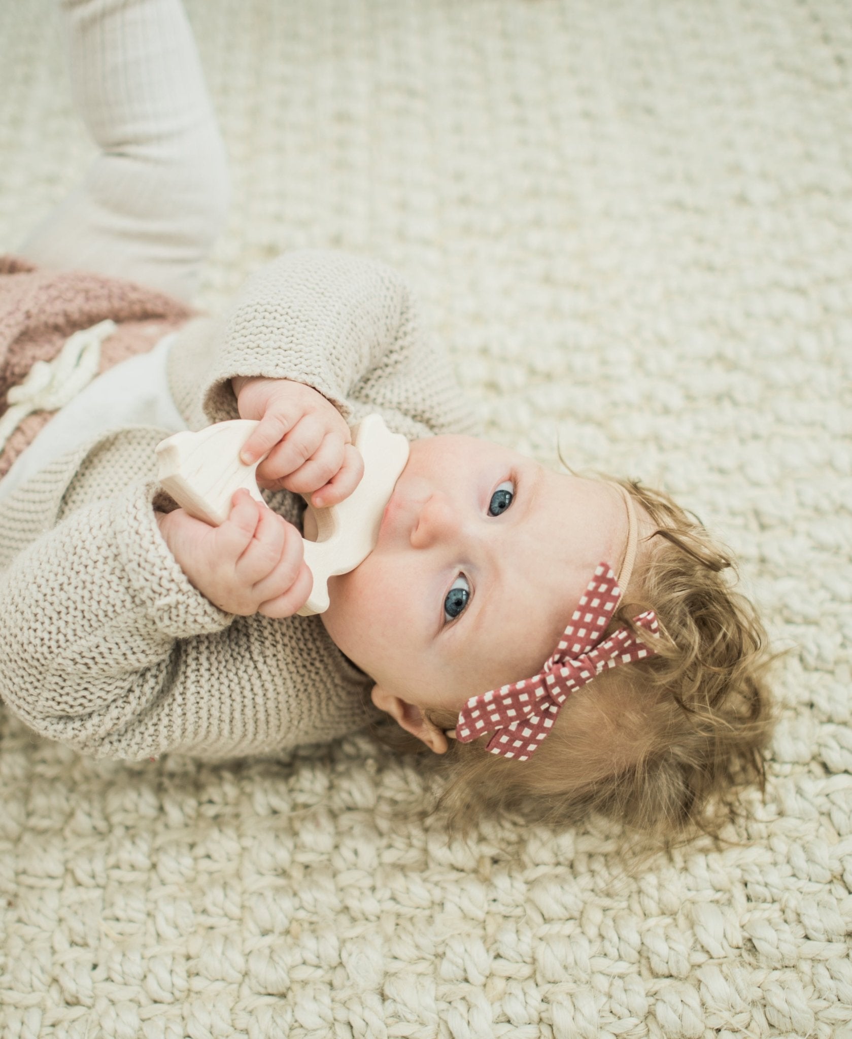 All grasping toys come sanded satin smooth and left natural with no finish. The Bunny is approximately 3"x3.25" with a grasping hole in the center.