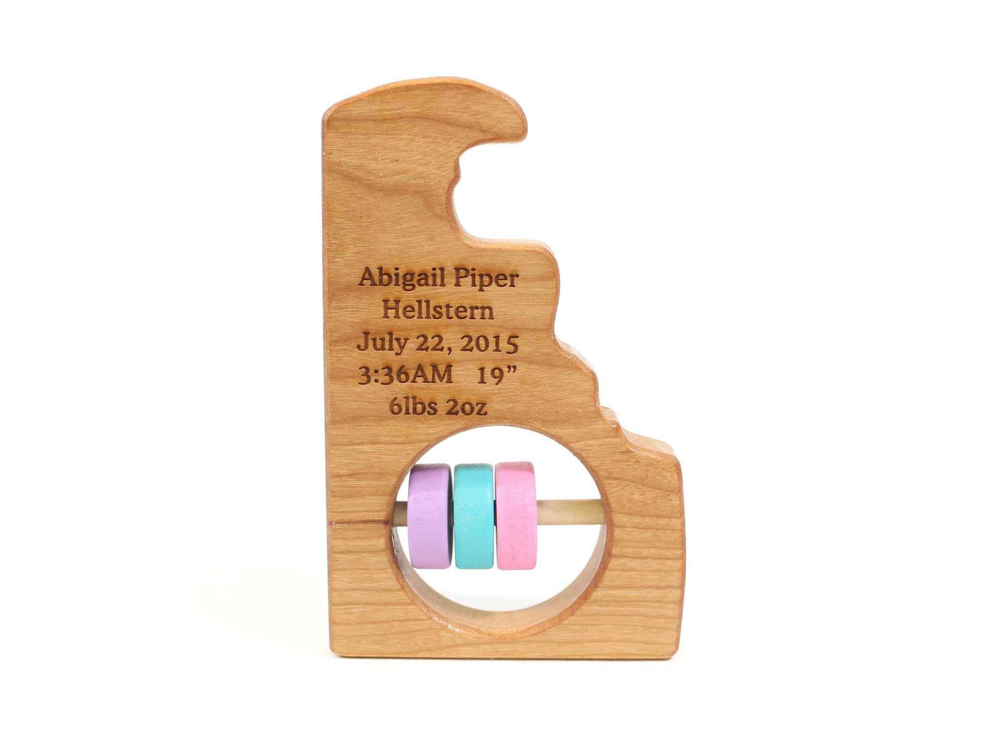 -Leave the rattle plain, or have it permanently laser engraved with a single word , two words or a child's birth stats (Full name, birth date, time, length, and weight). If you would like to put two words on the rattle (ex. Amy Jo or LilyAnn) or a hyphenated word (ex. John-Paul) you will need to choose two words from the drop down menu. If you would like 3 or more words or birth stats, please choose the birth stat option. If personalization is selected please tell us what to inscribe. If you choose the birth announcement option please tell us the full name, birth date, time, length, and weight.