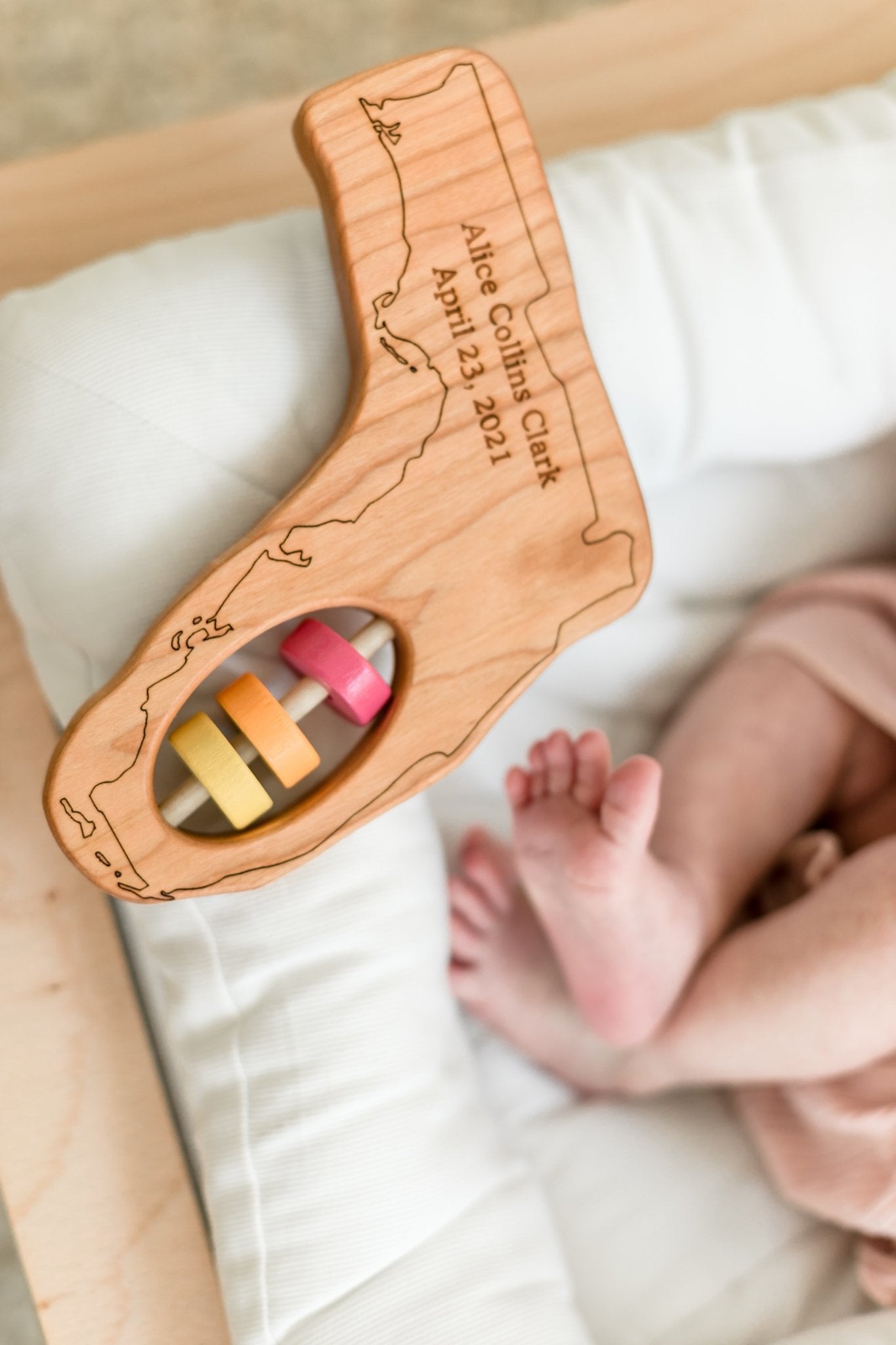 -Leave the rattle plain, or have it permanently laser engraved with a single word , two words or a child's birth stats (Full name, birth date, time, length, and weight). If you would like to put two words on the rattle (ex. Amy Jo or LilyAnn) or a hyphenated word (ex. John-Paul) you will need to choose two words from the drop down menu. If you would like 3 or more words or birth stats, please choose the birth stat option. If personalization is selected please tell us what to inscribe. If you choose the birth announcement option please tell us the full name, birth date, time, length, and weight.