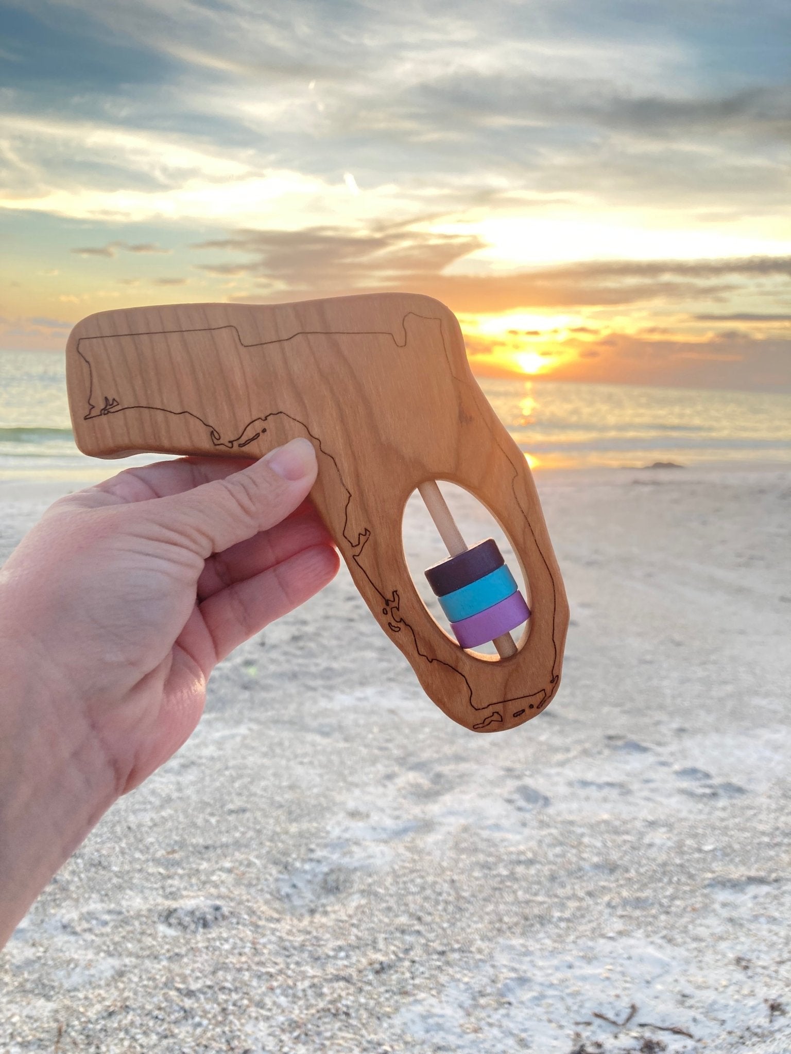 Show your state pride with this Florida State baby rattle™. This rattle is made from solid hardwood Cherry. This baby rattle is 100% organic, made from responsibly harvested woods, and is sure to last long enough to be passed down through several generations in your family. The finish is safe yet durable and made from an organic mix of flaxseed oil and locally grown beeswax. Choose any 3 colors for your disks!