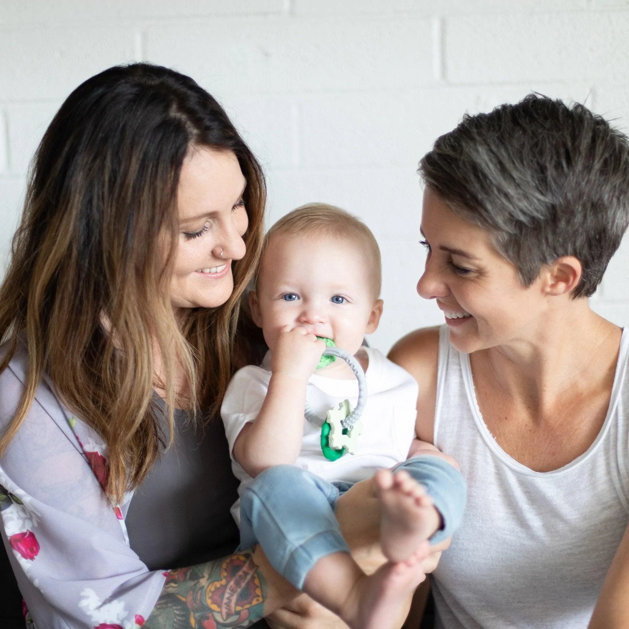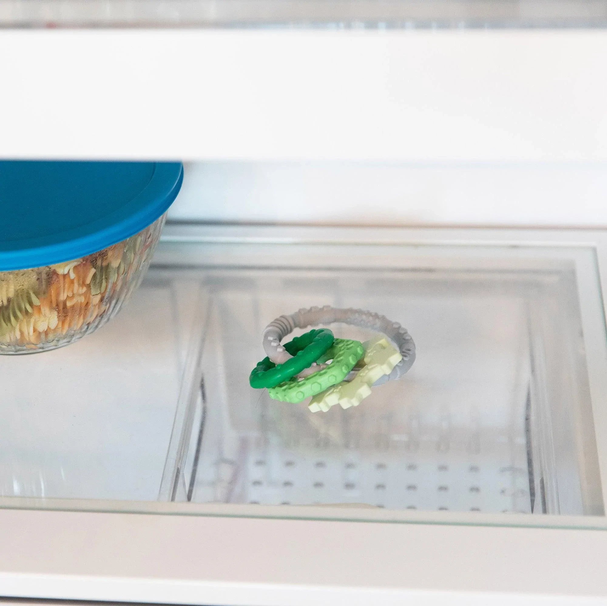 Get a grip on teething with these Silicone Teething Charms. Made from 100% food-safe silicone, the teething charms consist of one large, textured ring with three smaller textured charms. The ring and charms are easy for little hands to grip, allowing babies to hold on tight as they gnaw away aches from emerging teeth, while also developing motor skills. The main ring measures approximately 3” in diameter and the charms measure approximately 2” across.