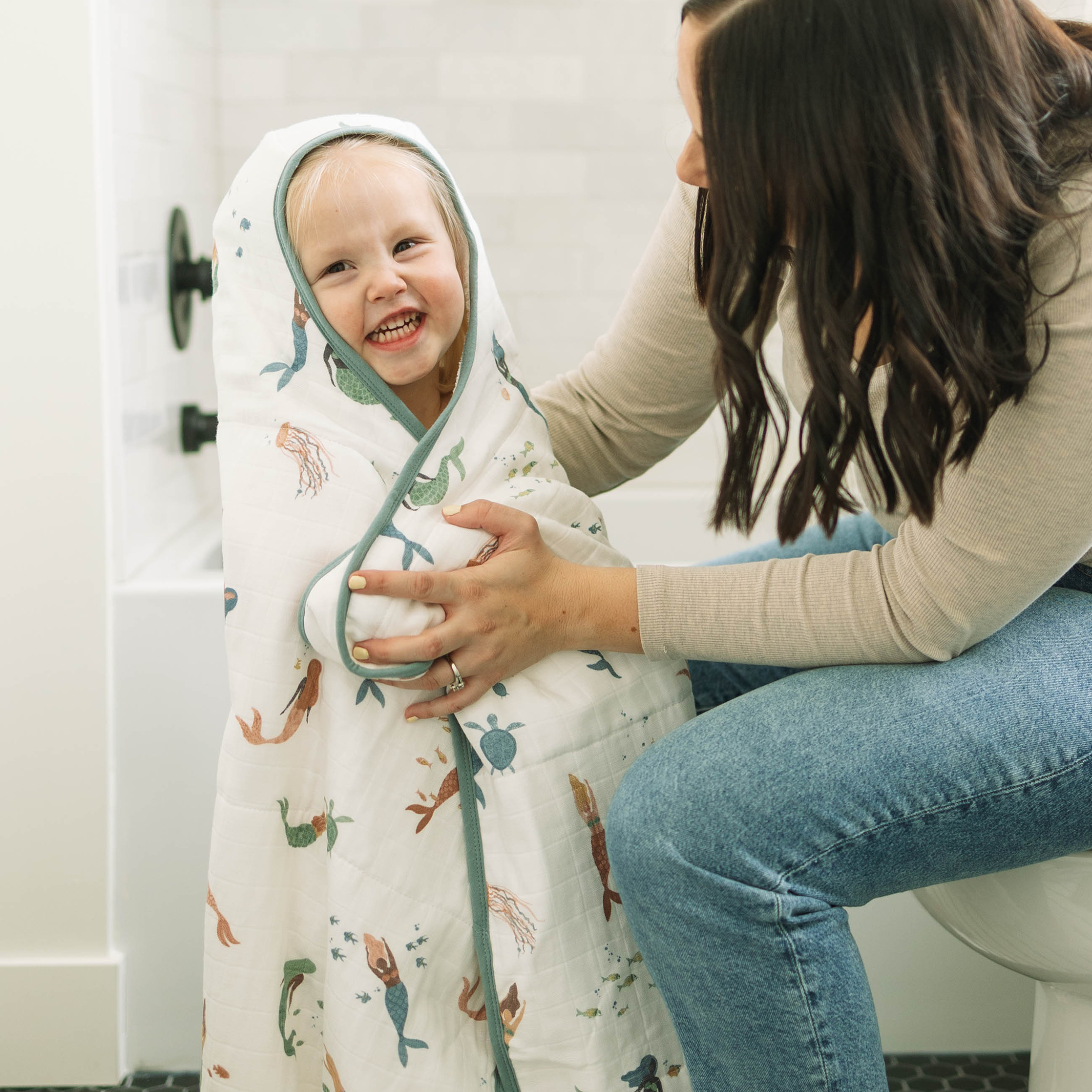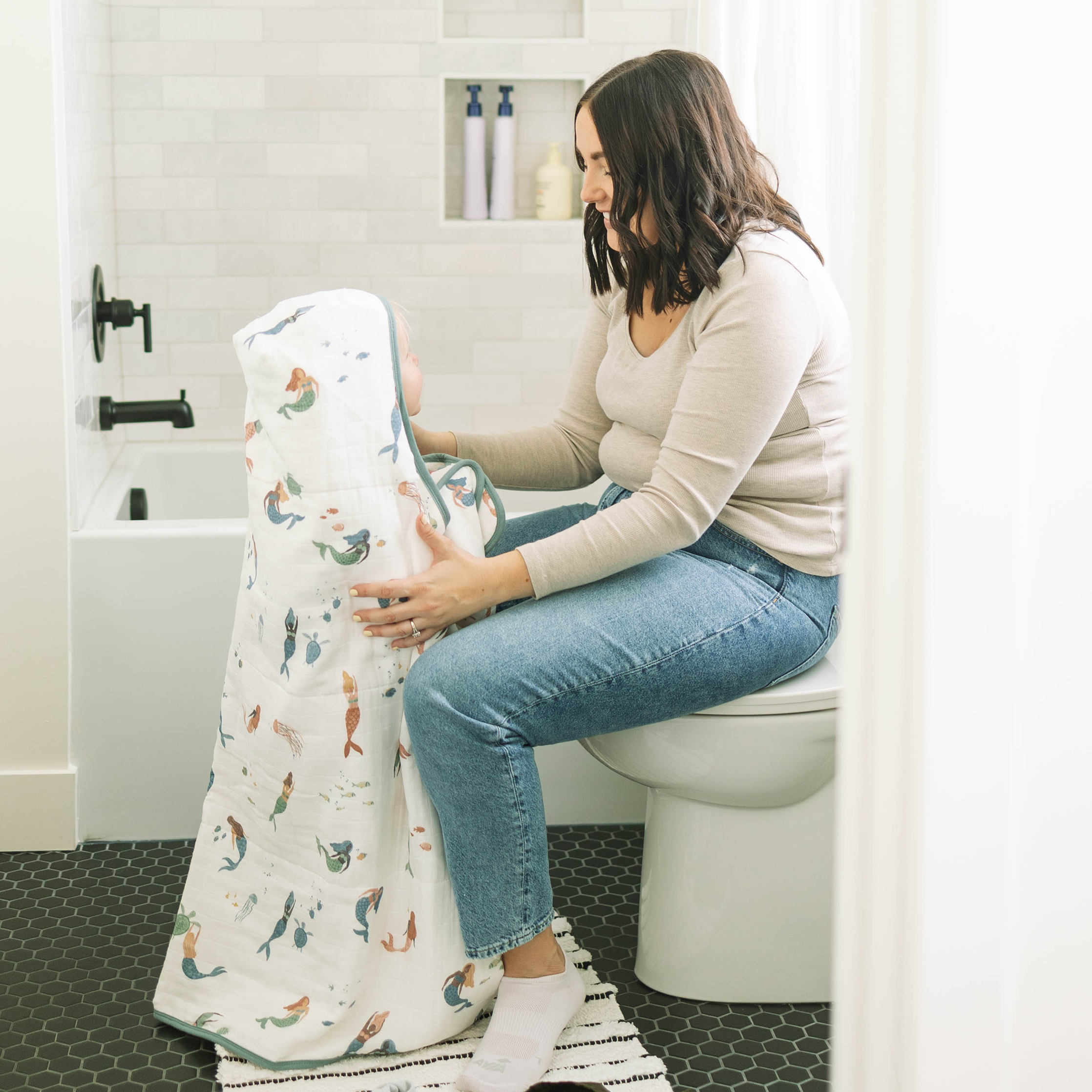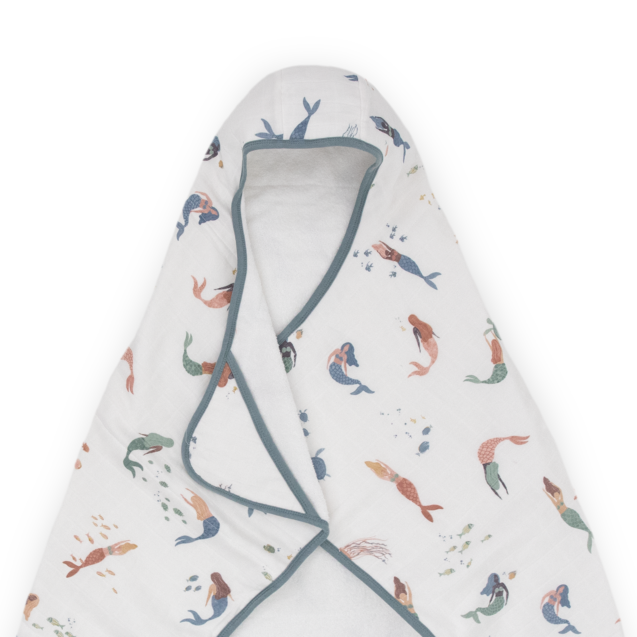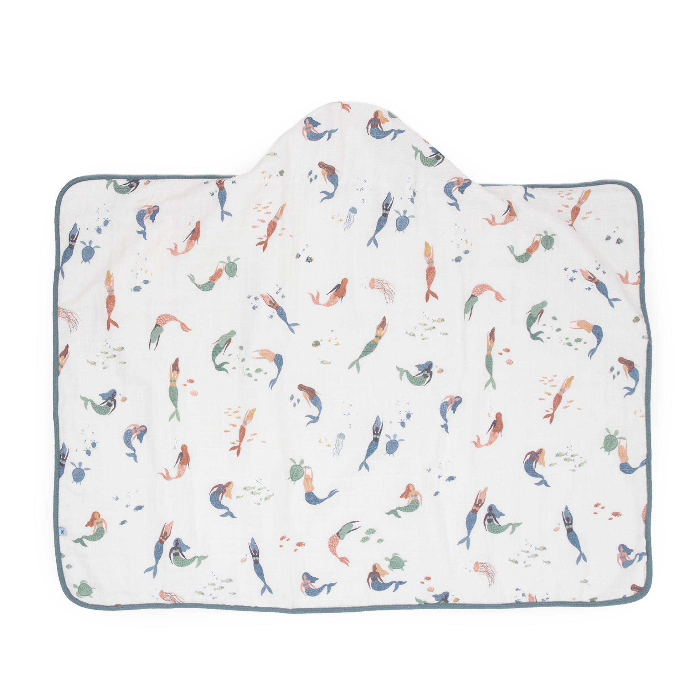 Splash into bath time with a plush and absorbent hooded towel. Featuring a cozy hood and pockets for little hands, the hooded towel is crafted with printed muslin on the outside and ultra-soft terry cloth on the inside.