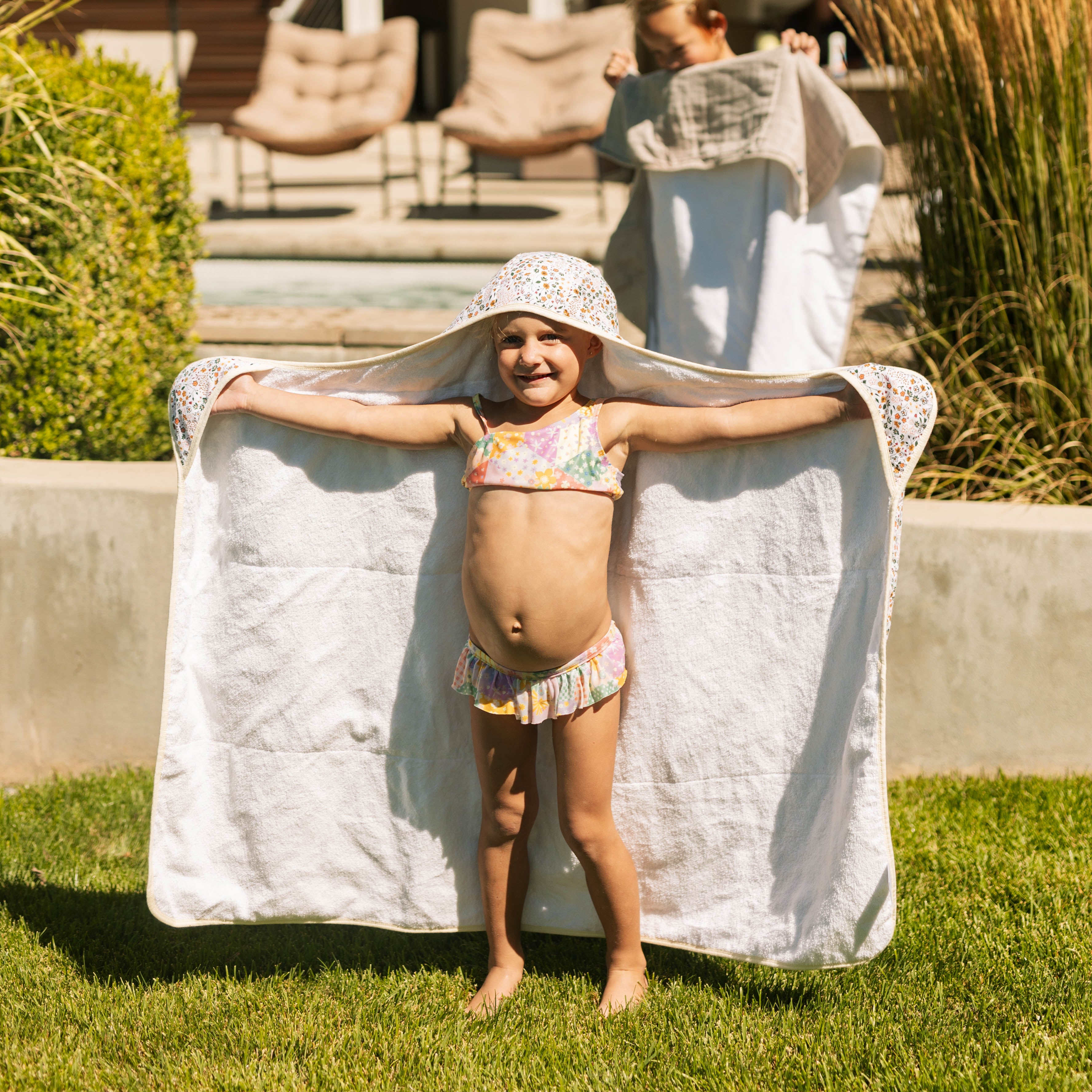 Splash into bath time with a plush and absorbent hooded towel. Featuring a cozy hood and pockets for little hands, the hooded towel is crafted with printed muslin on the outside and ultra-soft terry cloth on the inside.